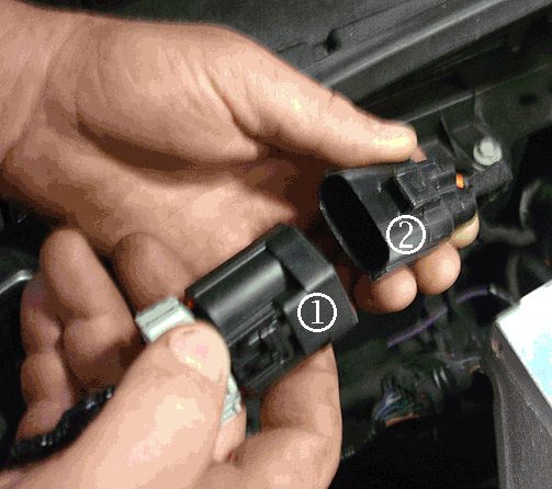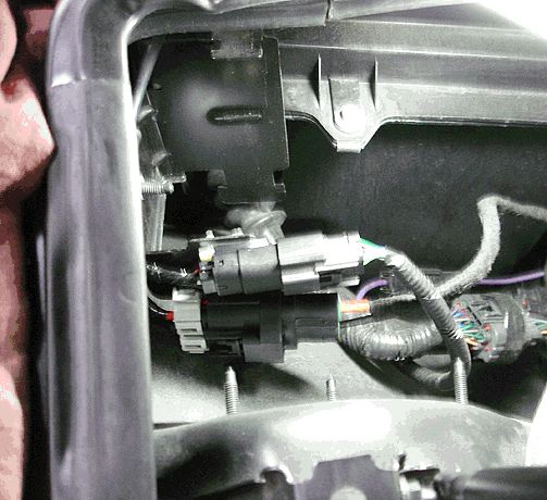 13. Secure the large two-wire connector and small five-wire connector to the windshield washer solvent heater assembly bracket.