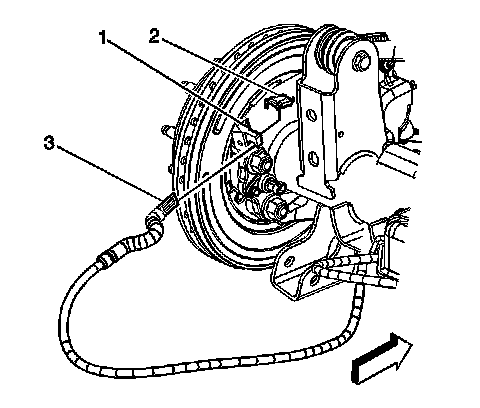 9. Disconnect the left-rear park brake cable (3) from the backing plate (1), the park brake actuator (2), and the cable guide at the rear axle.