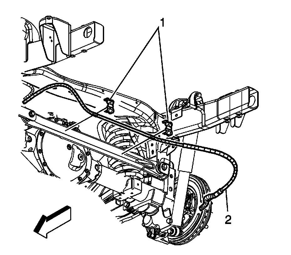 11. Disconnect the right-rear park brake cable (2) from the backing plate, the park brake actuator, and from the cable guide at the rear axle.