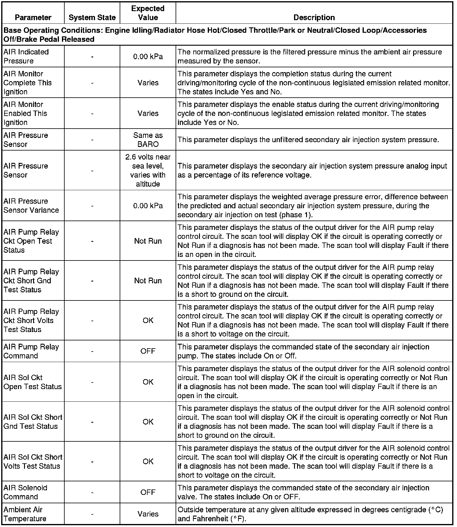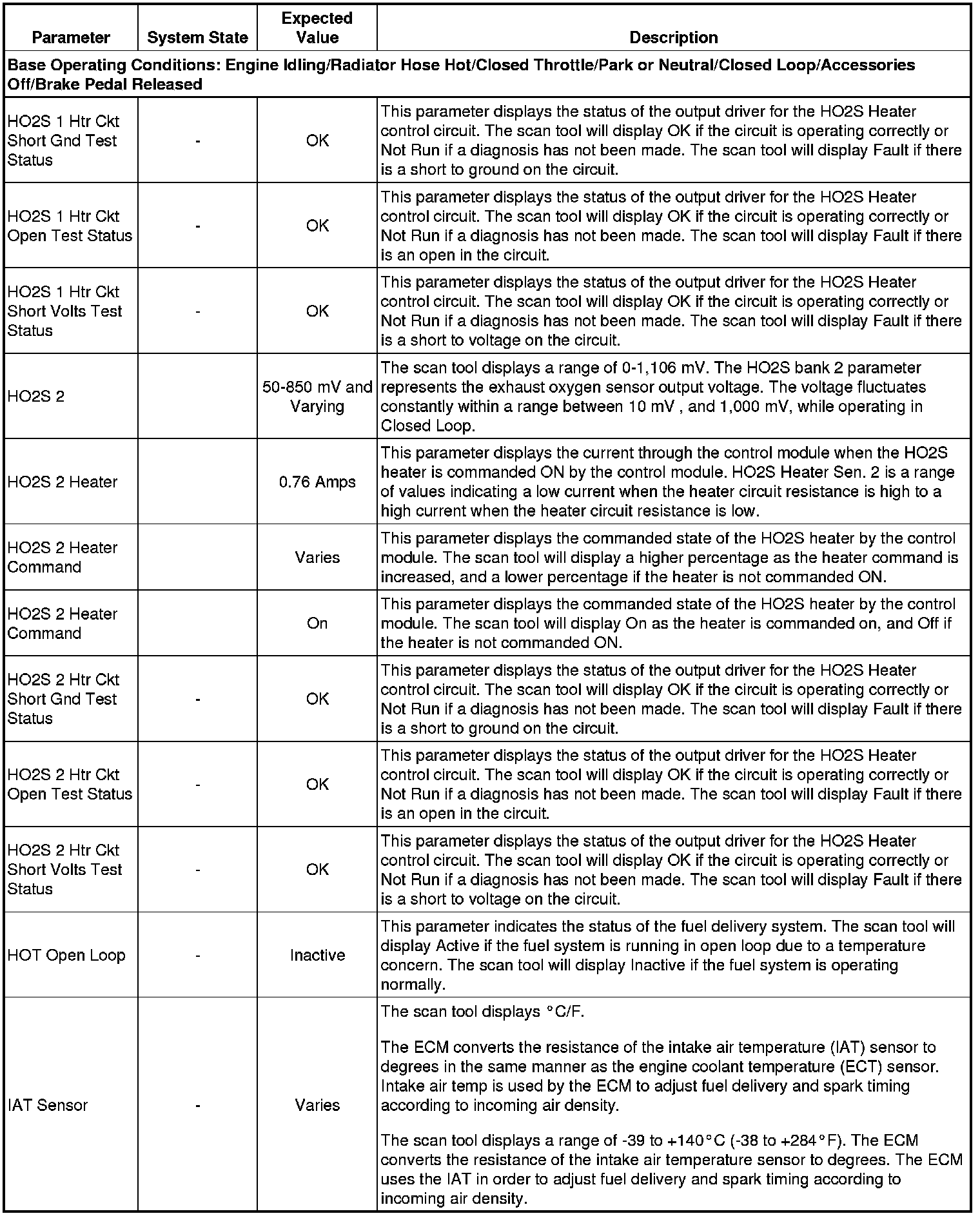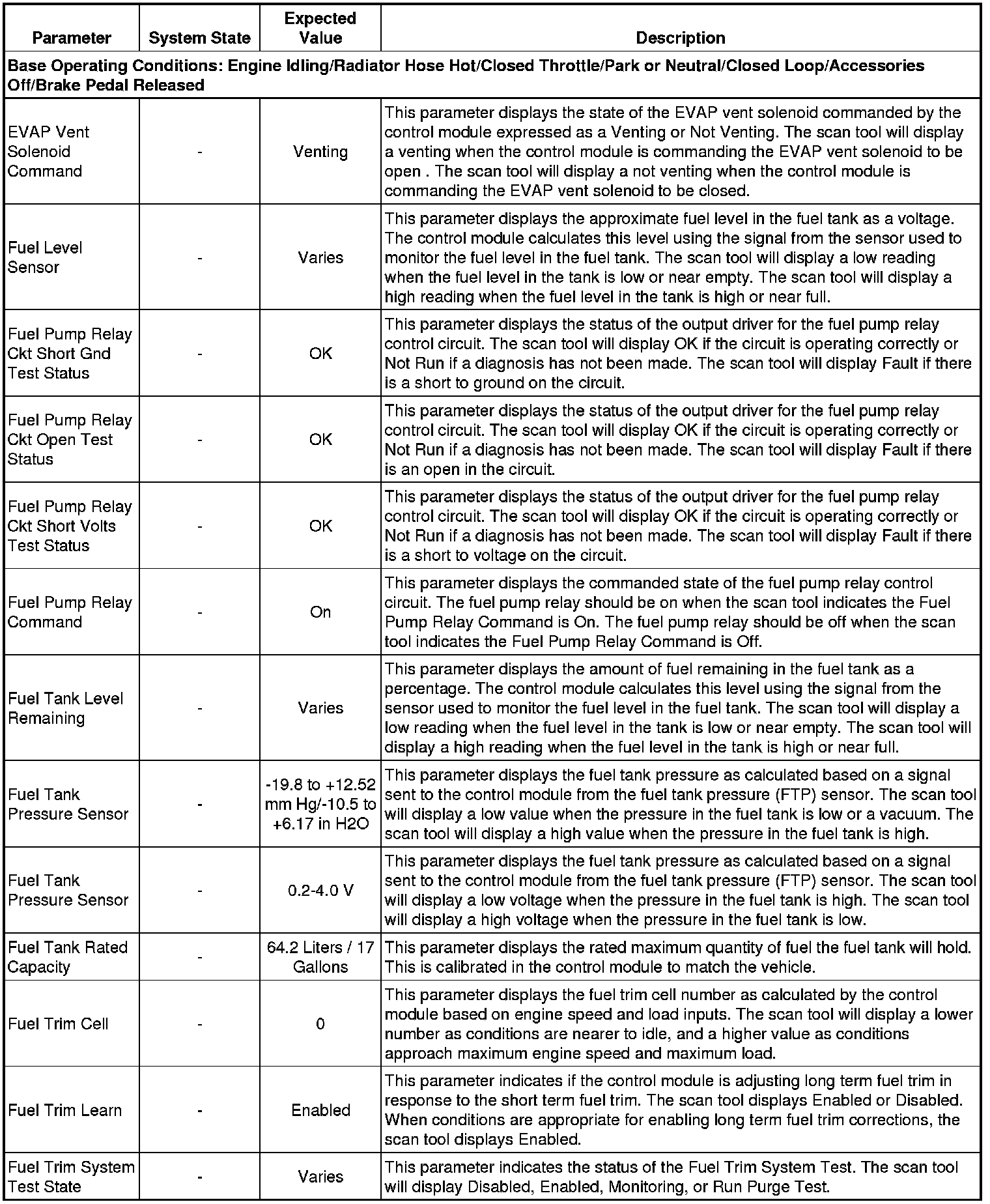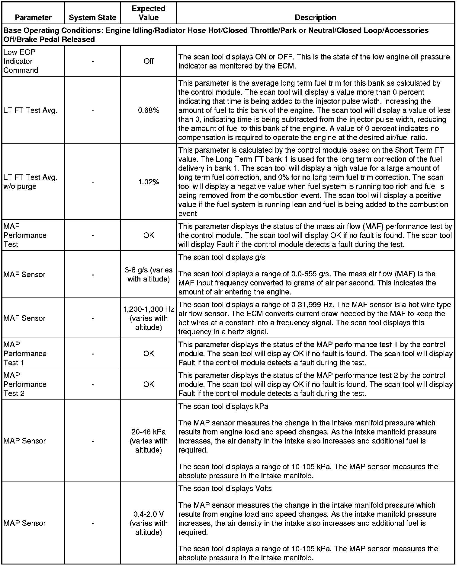 The scan tool values from a properly running engine may be used for comparison with the engine you are diagnosing. The Engine Scan Tool Data List represents values that would be seen on a normally running engine.