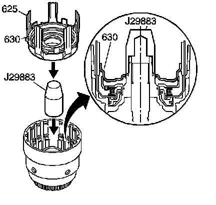 19. Install the overrun clutch spring retainer snap ring (635).
