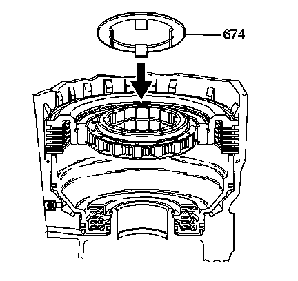 5. Install the thrust washer (674) with the tangs pointing down. Index the tangs of the thrust washer with the splines of the low and reverse roller clutch race.