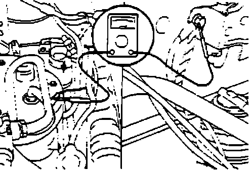 3. Warm up the engine until the radiator fan starts to operate. When the fan stops, check the voltage between the oxygen sensor body and the hood latch bolt using a digital multi-meter. Place the positive lead on the bolt and the negative lead on the sensor body, If the voltage is over 130mV, continue to next step. If the voltage is not over 130mV, go to step 5.