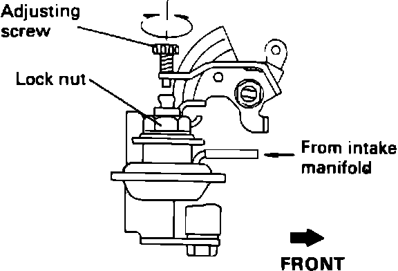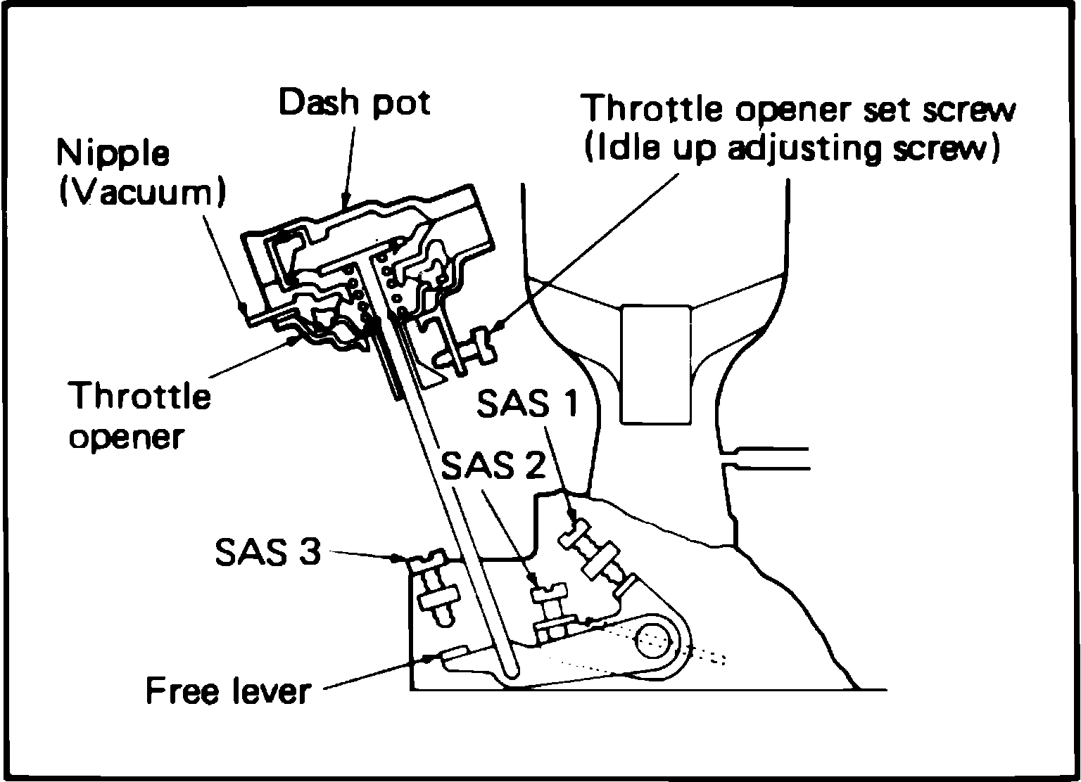 The throttle opener adjustment screw for electrical load (idle-up adjustment screw), is located on the carburetor, below the throttle opener/dash pot.
