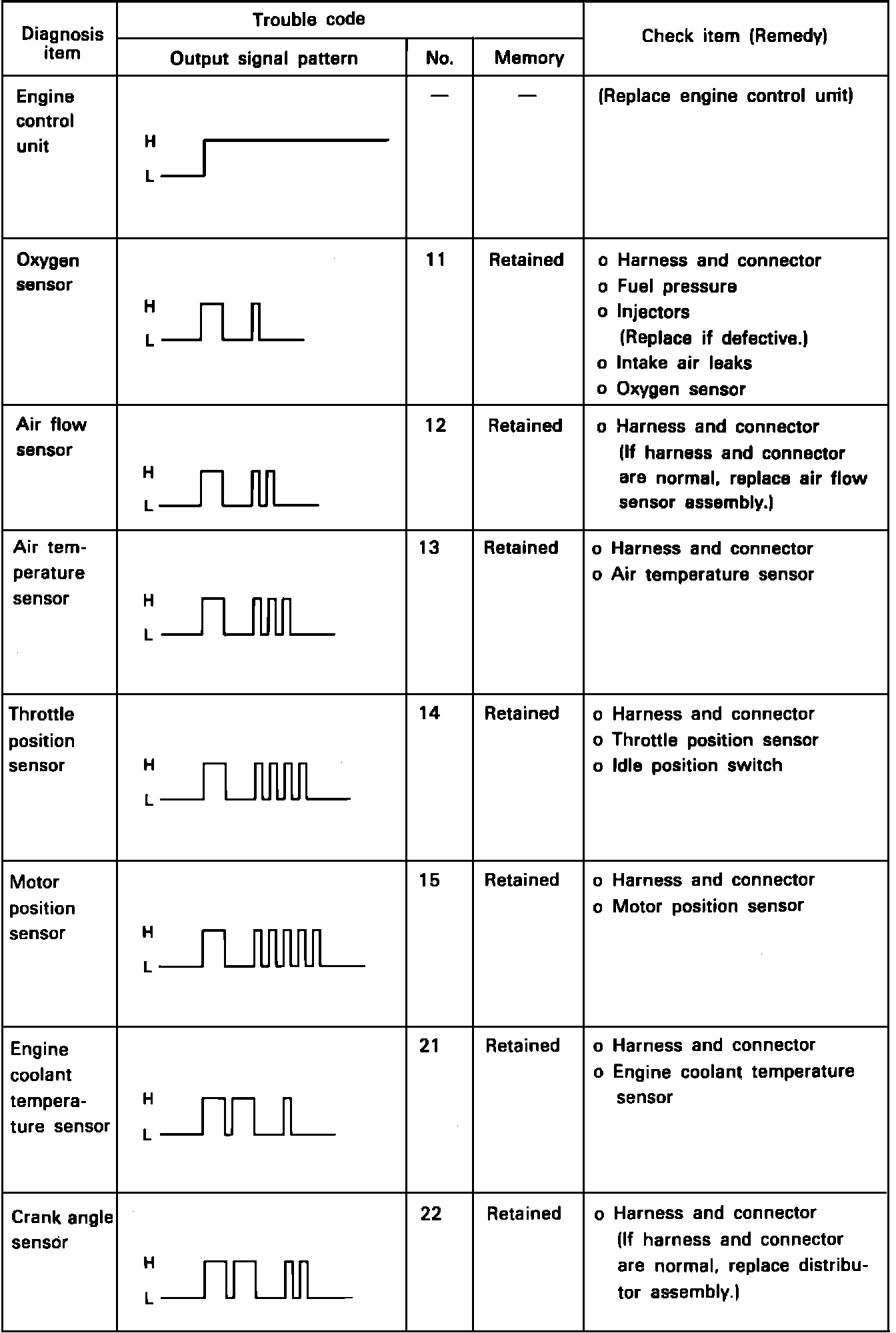 There are fifteen diagnostic items (including normal operation) that will generate diagnostic codes. These codes can be read out using a voltmeter by refering the diagnostic codes chart. The malfunction codes are erased when the vehicle battery is disconnected for more than fifteen seconds. Note! If the oxygen sensor is disconnected during engine operation for testing purposes a code will be stored and must be cleared after the test is complete. Do not however disconnect the battery with the ignition on or the engine running as permanent damage to the vehicle electronic components may result. If multiple malfunctions occur the diagnostic codes will be sent sequentially beginning with the lowest number code.