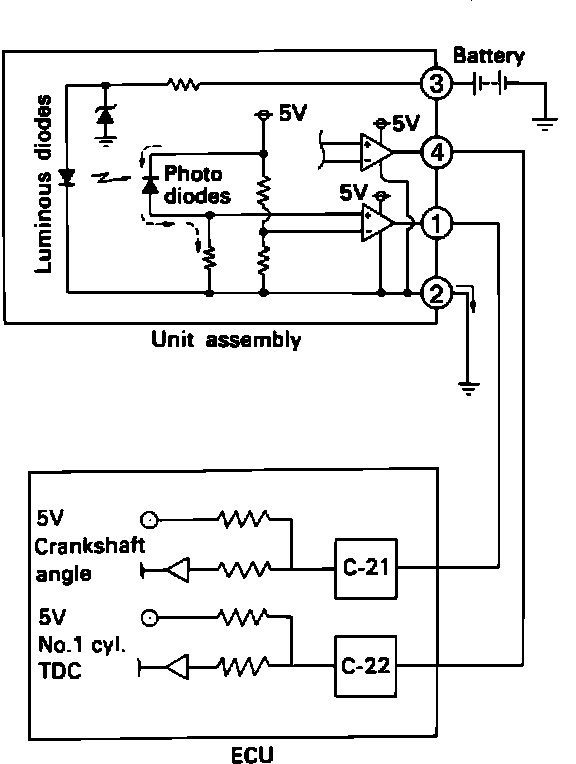 3. When the voltage is abnormal, check the sensor power and ground circuits. If nothing unusual is found, disassemble and inspect the distributor.