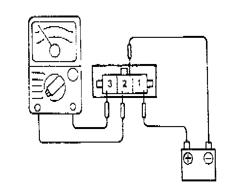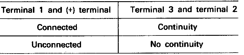 1. Connect the negative (-) terminal of a 3V power supply (1 dry cell battery) to terminal 2 of the power transistor; then check whether there is continuity between terminal 3 and terminal 2 when terminal 1 and the positive (+) terminal are connected and disconnected.