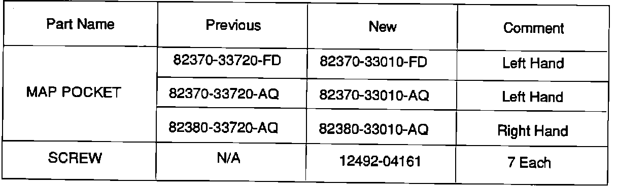 The replacement Map Pocket for Sonatas produced between 4-22-91 and 9-10-93, has been changed. A slight modification must be made to the Door Trim Panel to fit the new Map Pocket. The mounting snaps have been changed to screws. Seven screws must be ordered to attach each new Map Pocket.