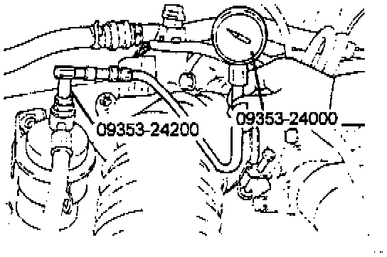 3. Using the Fuel Pressure Gauge Adapter (09353-24000, 09353-24200), install the Fuel-Pressure Gauge to the Fuel Filter. Tighten the bolt to the specified torque.