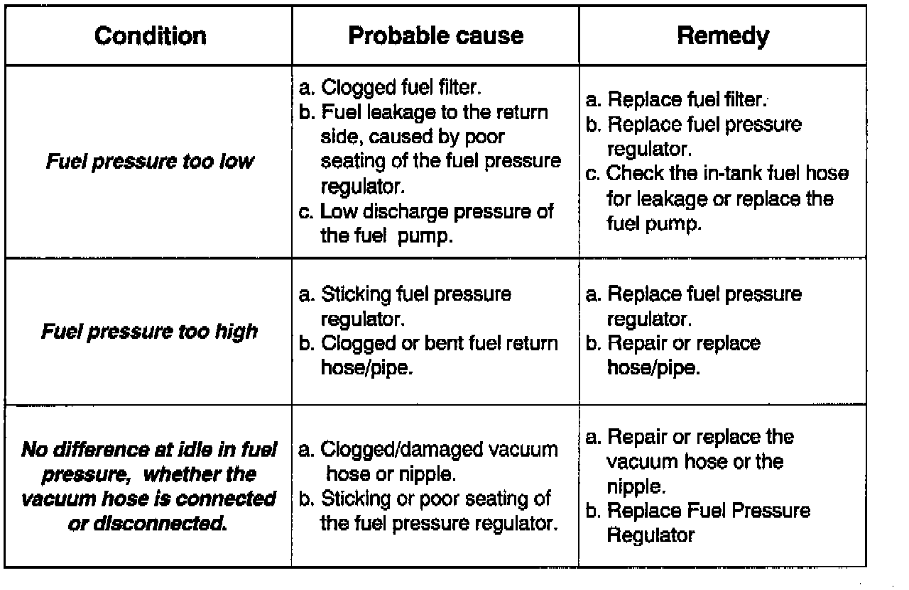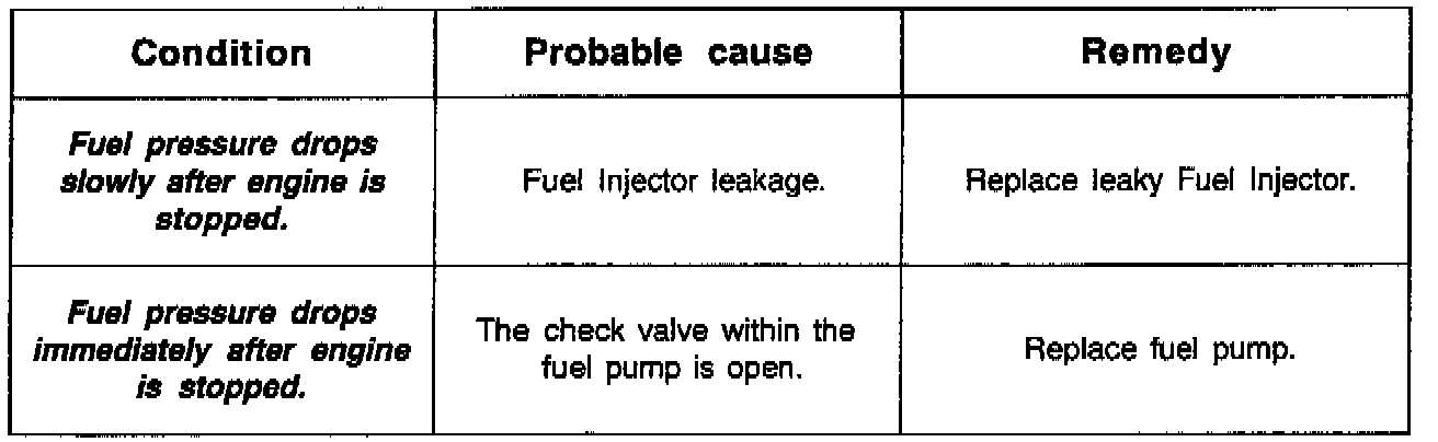 9. Stop the engine and check for a change in the fuel pressure reading. The fuel pressure should hold for approximately 5 minutes. If the fuel pressure drops more than 5 psi, use the table to determine the cause.