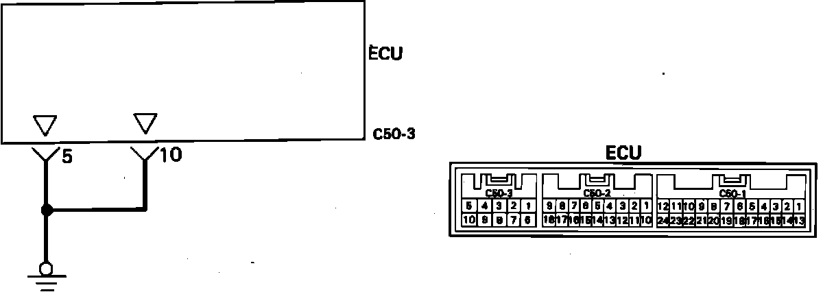 10. Using an ohm meter, check for continuity between the ECU harness connector C50-3 terminal 10 (black wire) and ground.
