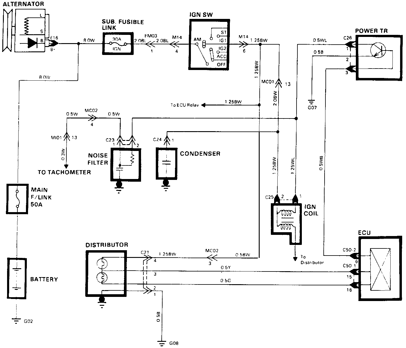 An ECU controlled power transistor is used as a switch to regulate current flow through the coil primary circuit. Each time current flow is interrupted, high voltage is induced to fire the spark plugs. Except for the initial setting, timing is determined by the ECU.