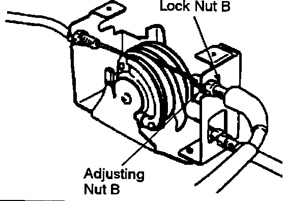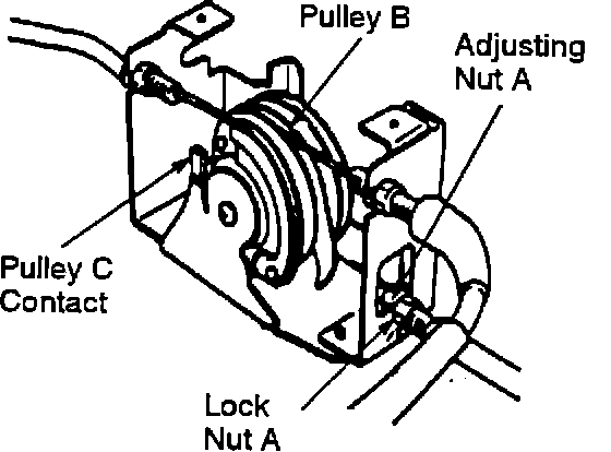 3. ACCELERATOR CABLE ADJUSTMENT Loosen lock nut A sufficiently to allow cable adjustment. Turn adjusting nut A until pulley B just begins to move away from the pulley C contact. Then, turn adjusting nut A in the opposite direction approximately 1/2 turn. The accelerator cable play (inner cable to cable housing movement measurement) should be 1-2 mm (.04-.08 in.). Tighten lock nut A and verify accelerator cable play.