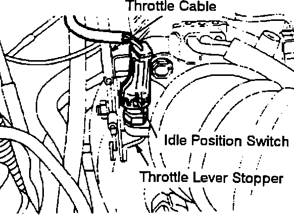 7. Release the accelerator pedal and again verify that the throttle lever stopper completely depresses the idle switch plunger.