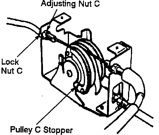 5. CRUISE CONTROL CABLE ADJUSTMENT Loosen lock nut C sufficiently to allow cable adjustment. Turn adjusting nut C until pulley C begins to move away from its stopper. Then, turn adjusting nut C in the opposite direction approximately 1/2 turn. The accelerator cable play (inner cable) should be 1-2 mm (.04-.08 in.). Tighten lock nut C and verify inner cable play.