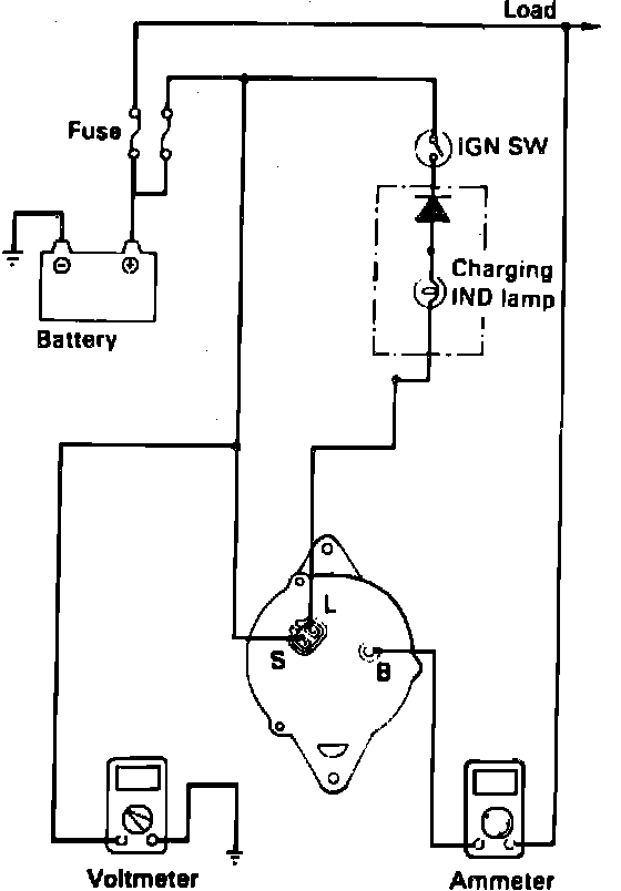 4. Place ignition switch in the On position and note voltmeter. The reading should be battery voltage. If reading is 0, there is either an open circuit in the wire between alternator S terminal and battery positive terminal or a blown fusible link.