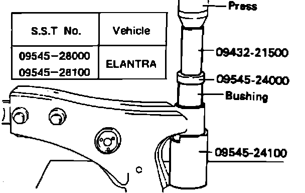 5. Press the new bushing into the lower arm using the same special service tools.