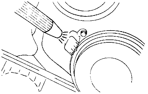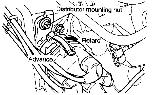 3. If there is a deviation from the standard value, loosen the distributor's holding nut, and then turn the distributor itself and make the necessary adjustment. The ignition timing will be advanced if the distributor is turned to the left and retarded if it is turned to the right. After adjustment, tighten the mounting nut.