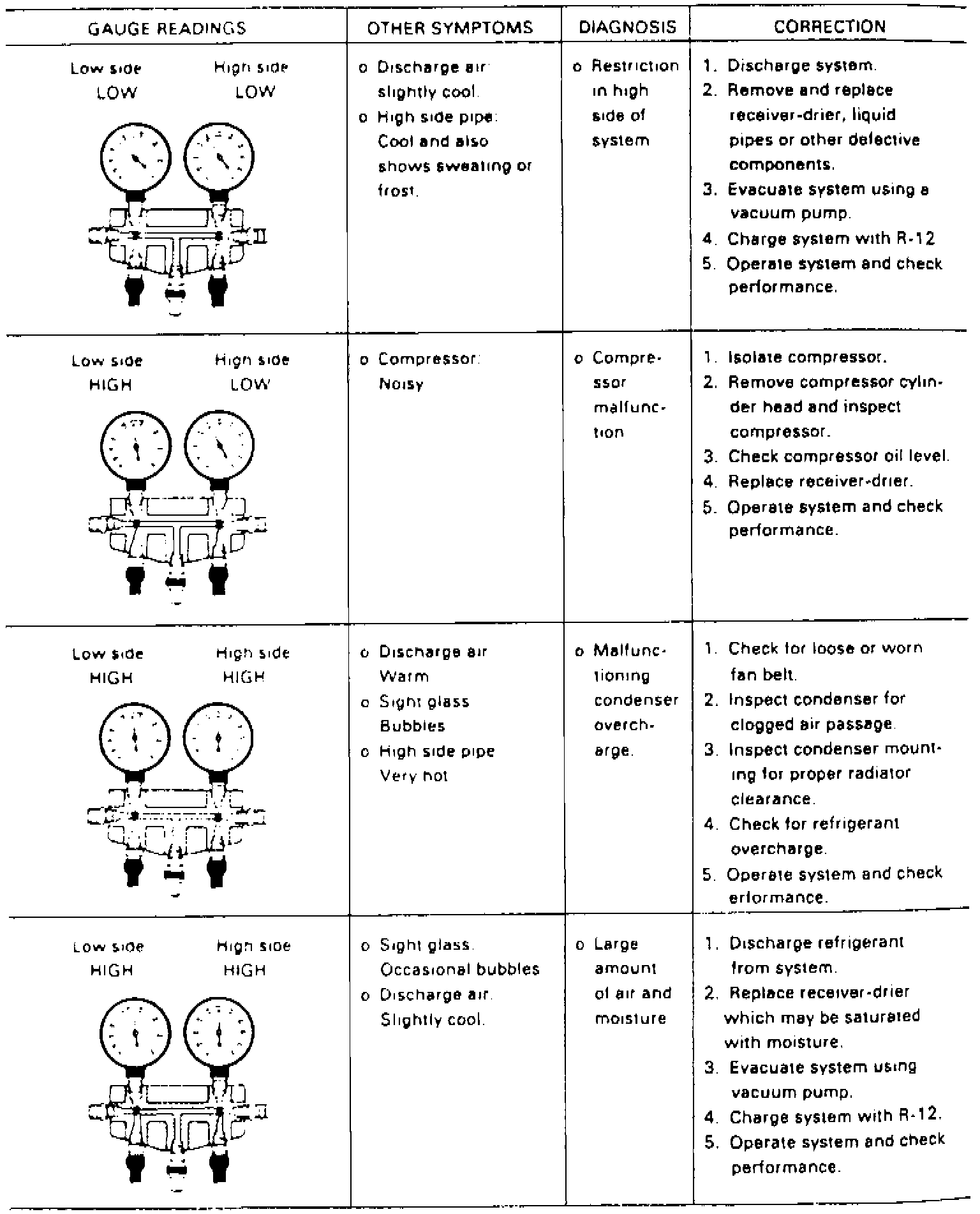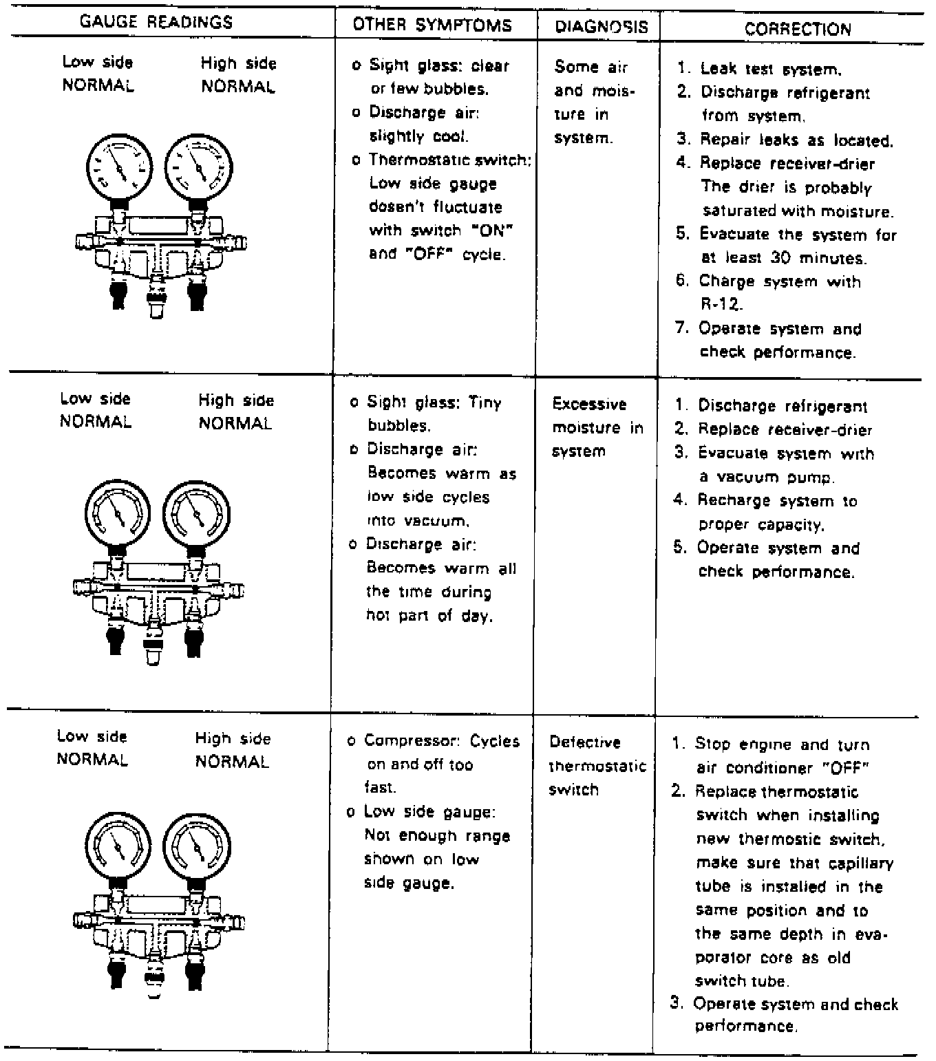 12. If system performance is not satisfactory, refer to Fig. 3. The marked portion of each gauge scale indicates a range based on the assumption that the air conditioning system is in good working order.