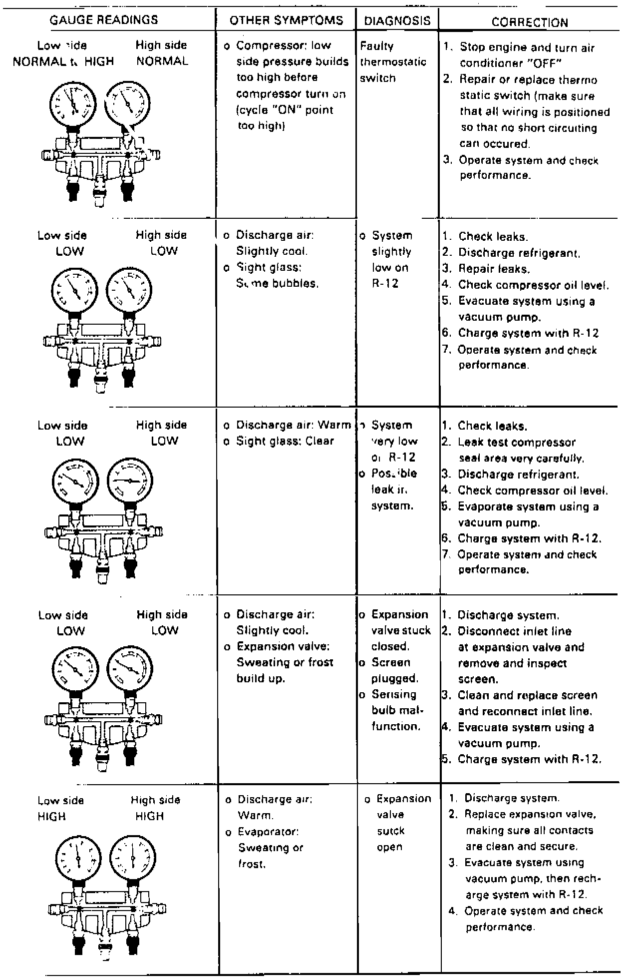 1. Install manifold gauge set.2. Run engine at 2000 RPM and set controls for maximum cooling and high blower speed.