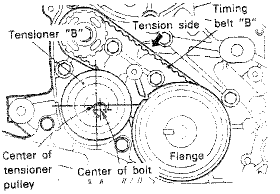 6. Lift tensioner "B" to tighten timing belt "B" so that its tension side will be pulled tight. In this condition, tighten bolt to secure tensioner "B." When bolt is tightened, use care to prevent shaft from turning together. If shaft is turned together, belt will be overtightened.