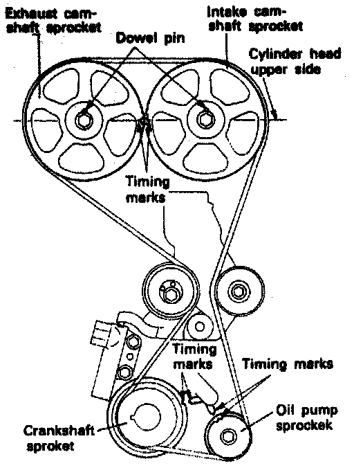 16. Turn the two sprockets so that their dowel pins are located on top. Then, align the timing marks facing each other with the top surface of the cylinder head.