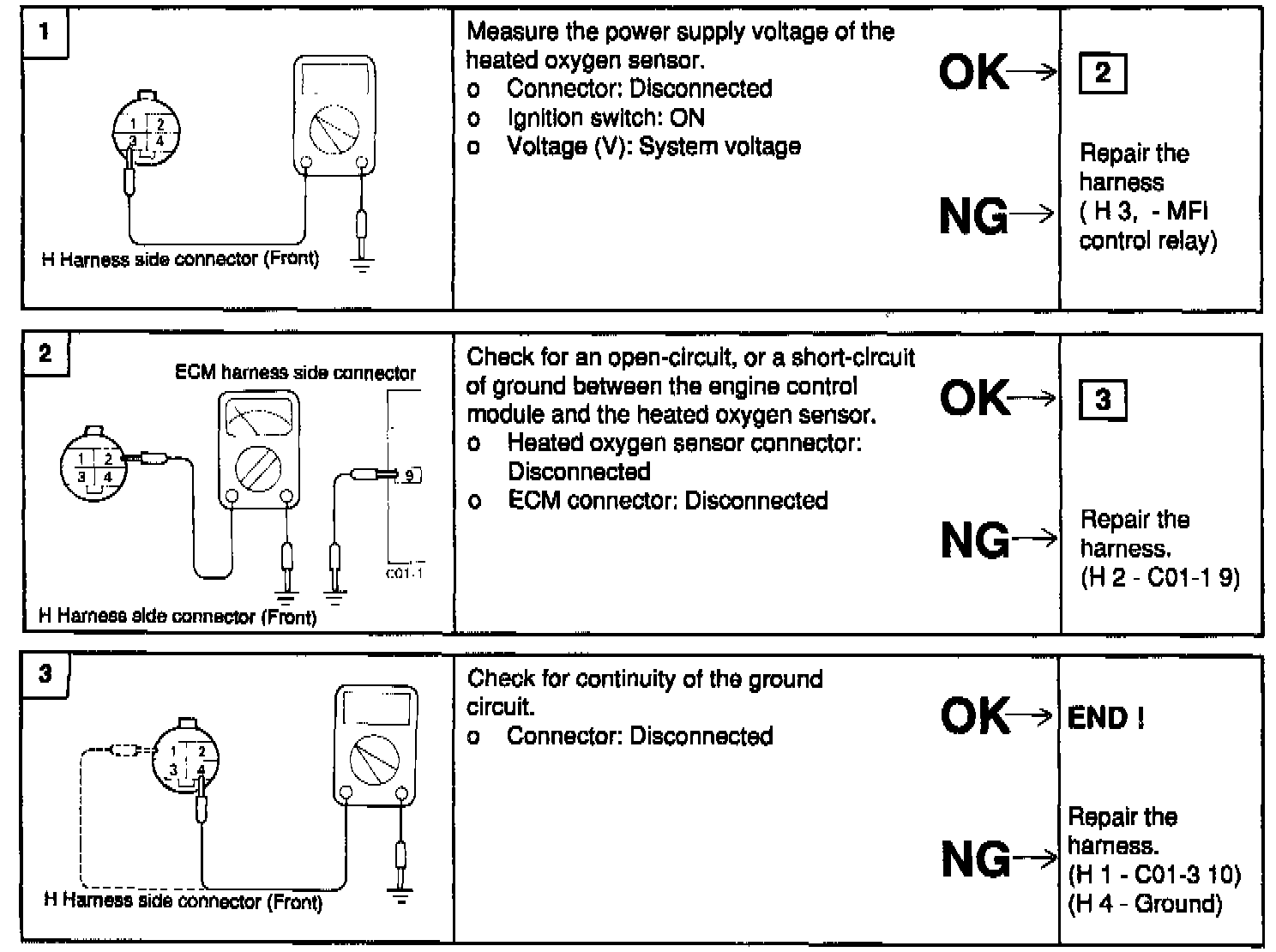 1. Disconnect the oxygen sensor connector, and measure the resistance between terminal 3 and terminal 4.