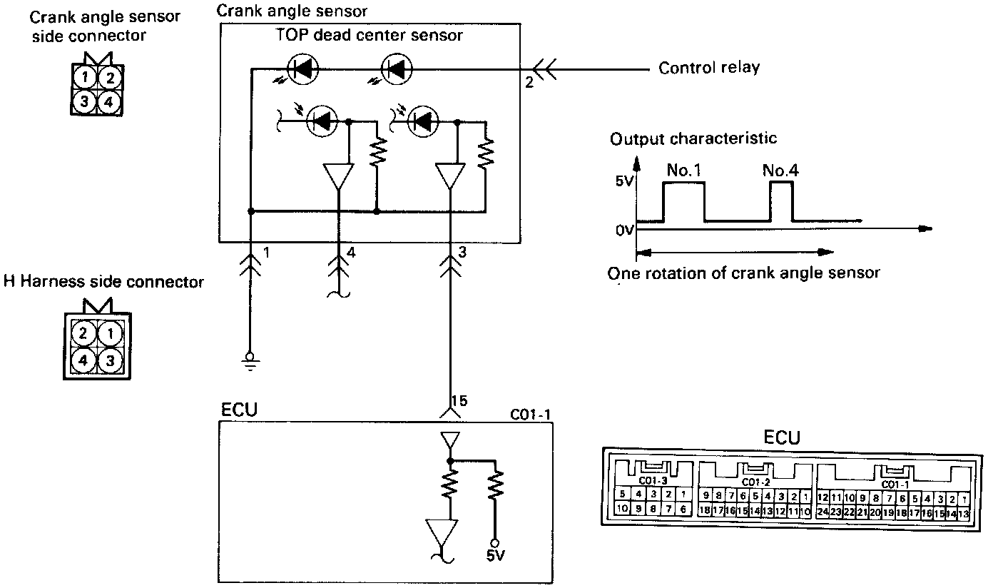 TOP DEAD CENTER (TDC) SENSORThe TDC sensor senses the top dead center on compression stroke of the No.1 and No.4 cylinders, converts it into a pulse signal and inputs it to the ECU. The ECU which then computes the fuel injection sequence, etc. based on the input signal.