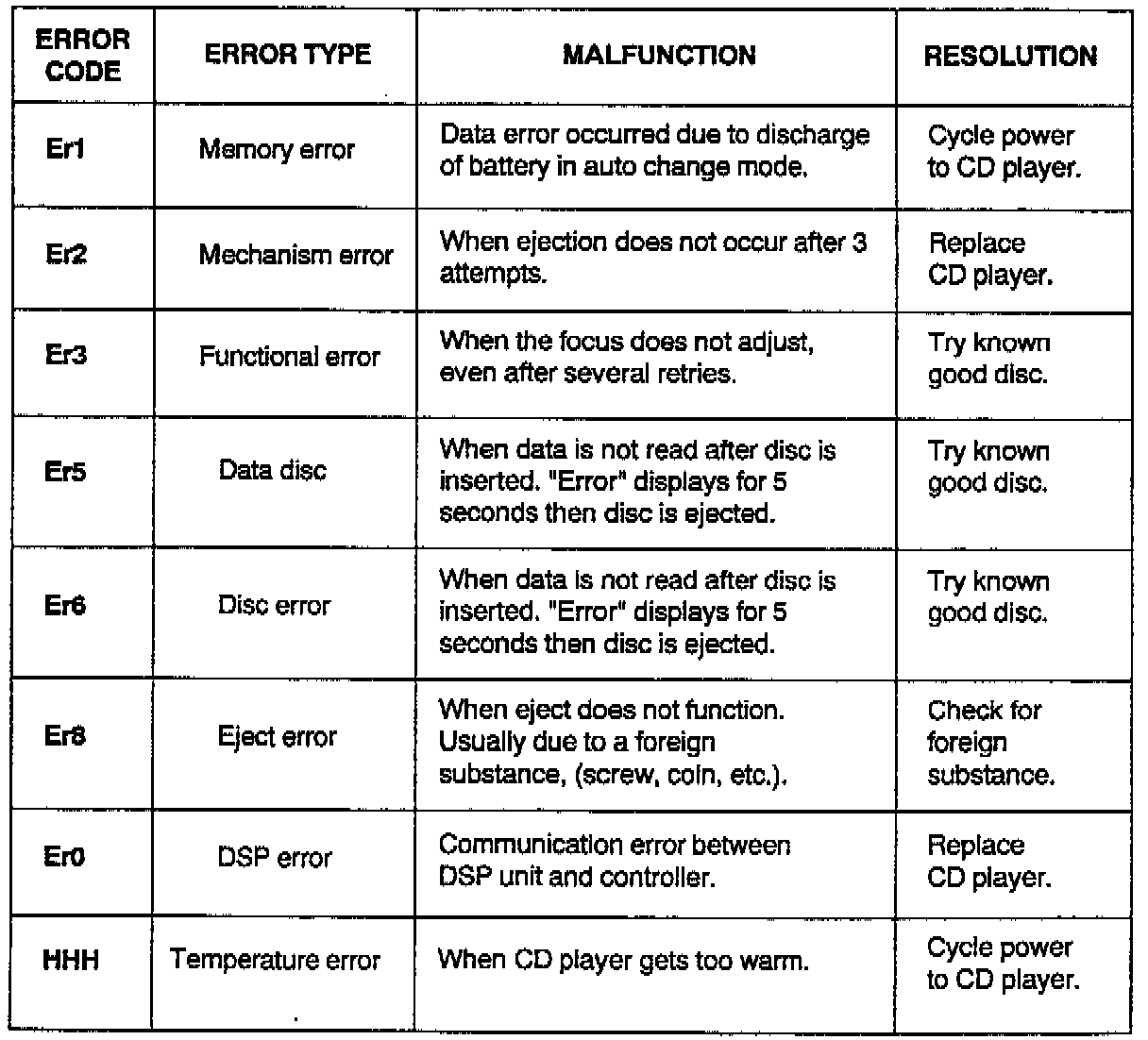 CD PLAYER ERROR CODES