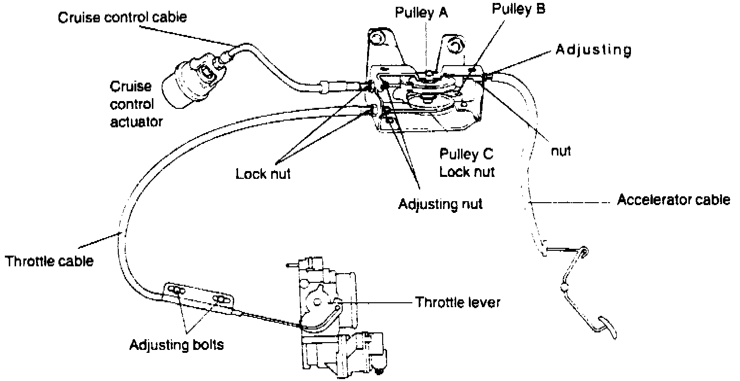 8. Tighten adjusting nut A to lessen inner play of cruise control cable. When intermediate pulley lever A touches intermediate pulley B, unscrew adjusting nut A approximately one turn.
