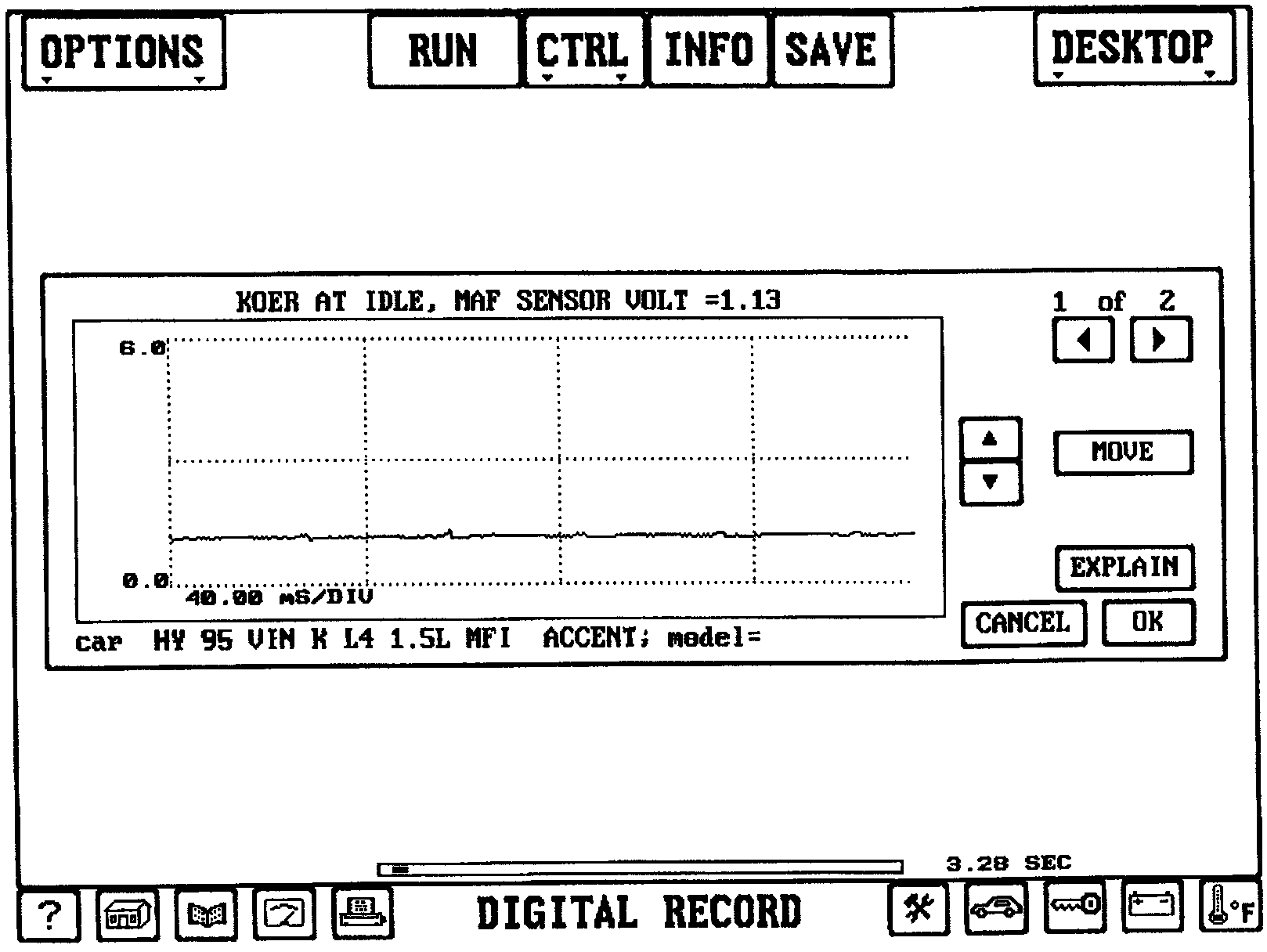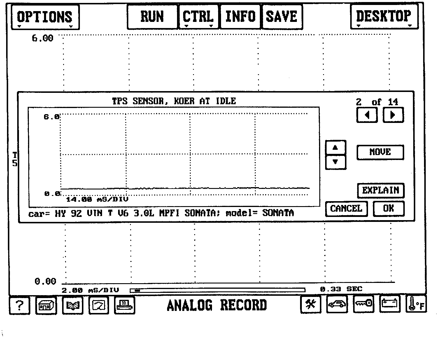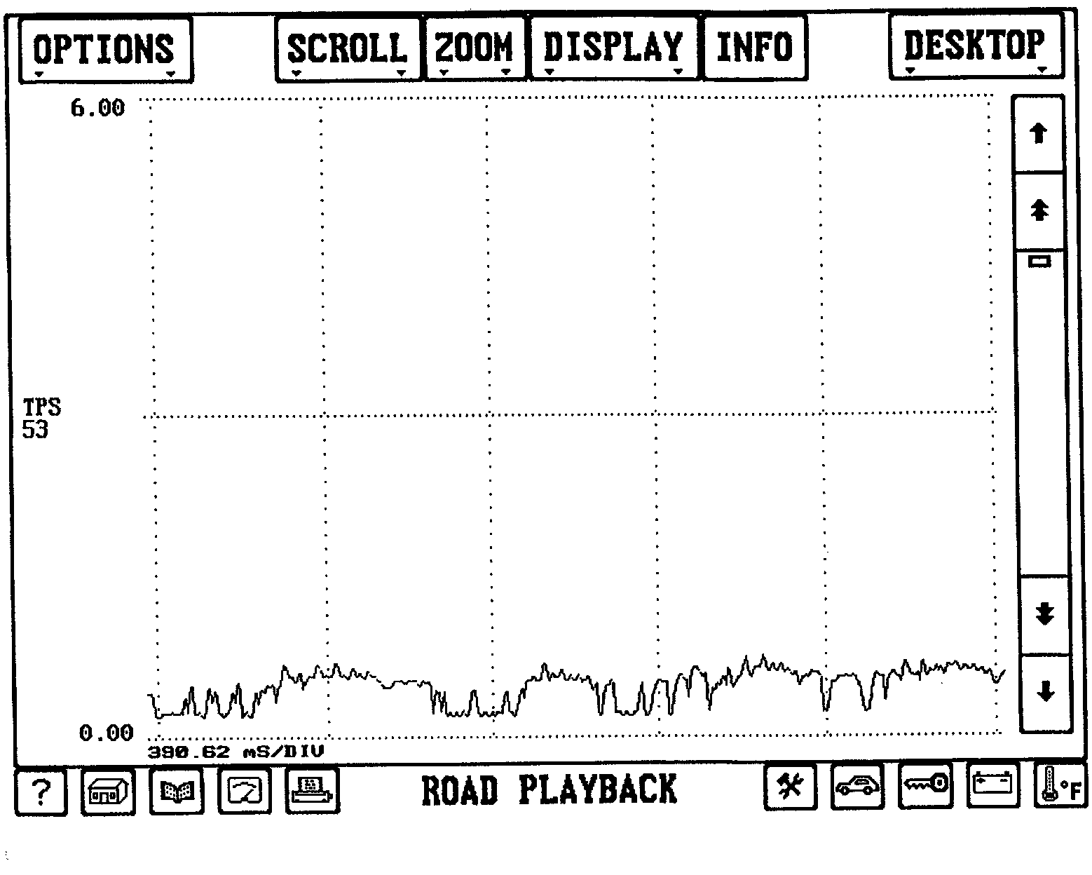 When diagnosing the driveability conditions listed above, the stability of the TPS and MAF signals should be verified. At idle and steady cruise, the TPS and MAF signals should be steady voltages. If a fluctuating signal is observed, the connection at the related sensor should be verified. Plots using HDS are shown to illustrate normal TPS and MAF signals at idle. A third plot illustrates an erratic TPS signal at idle taken from a vehicle with a poor contact at the sensor connection. See following plot illustrations.