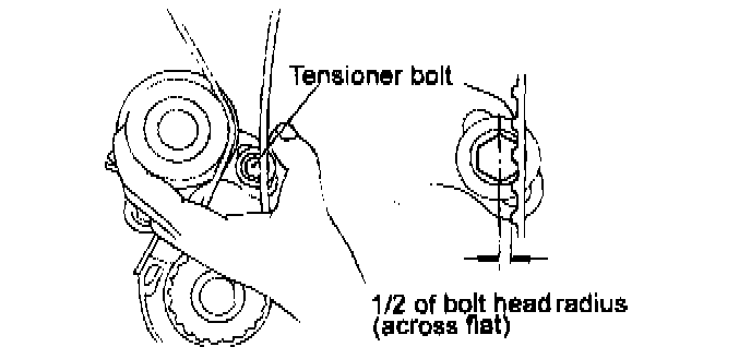13. Then recheck the belt tension. Verify that when the tensioner and the tension side of the timing belt are pushed in horizontally with a moderate force [approx. 49 Nm (11 lb)], the timing belt cog end is aprox. 1/2 of the tensioner mounting bolt head radius (across flats) away from the bolt head center.