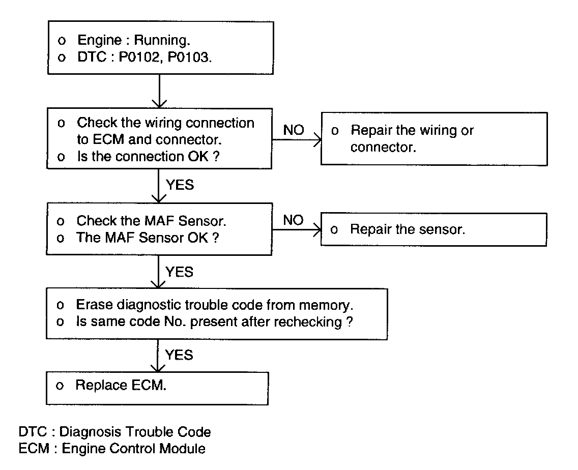 2. If the MAF sensor output voltage is other than 0 when the ignition switch is turned on (do not start the engine). Check for the faulty MAF sensor or ECM.