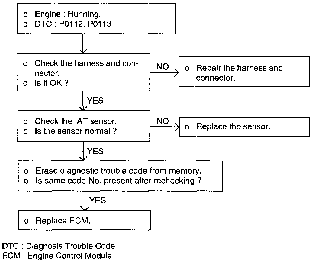 Input from intake air temperature sensor is below 0.1 V or above 4.8 V when engine is full warm-up condition.