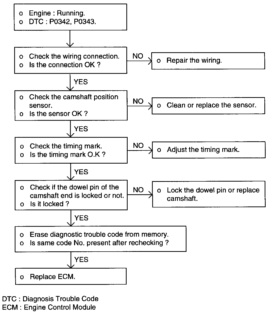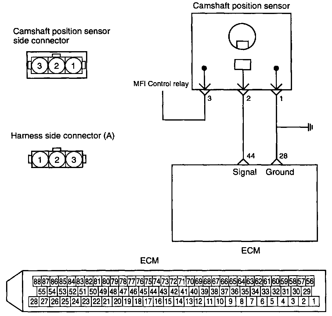 If the camshaft position sensor does not operate correctly, correct sequential injection is not made so that the engine may stall or run irregularly at idle or fail to accelerate normally.