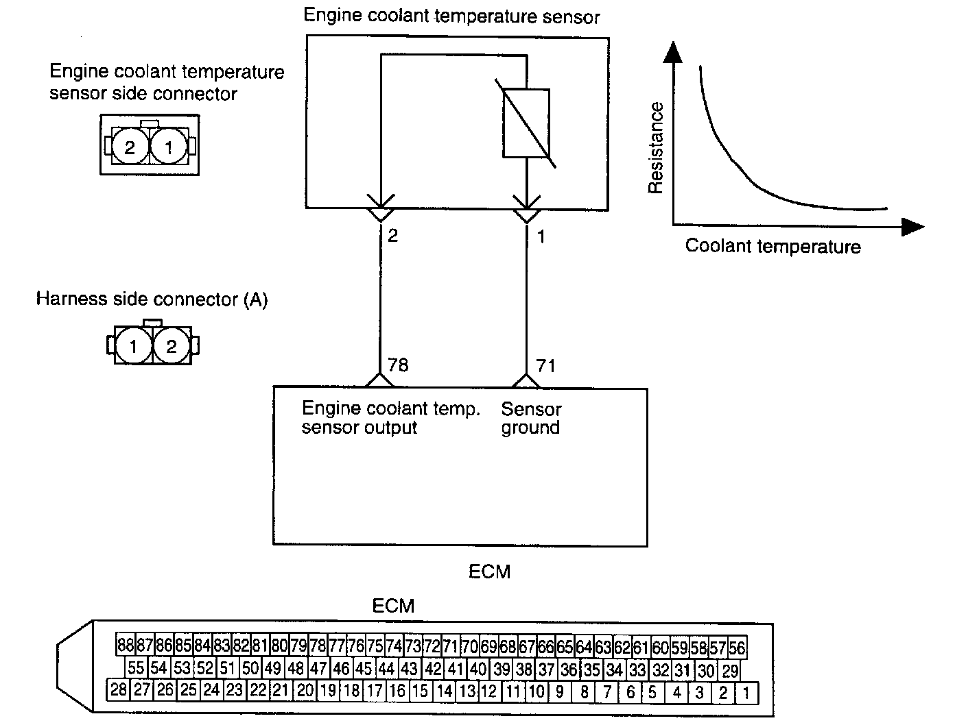ENGINE COOLANT TEMPERATURE (ECT) SENSORThe engine coolant temperature sensor is installed in the engine coolant passage of the cylinder head, detects engine coolant temperature and emits signals to the ECM. This part employs a Thermistor which is sensitive to changes in temperature. The electric resistance of a Thermistor decreases in response to temperature rise. The ECM judges engine coolant temperature by the sensor output voltage and provides optimum fuel enrichment when the engine is cold.