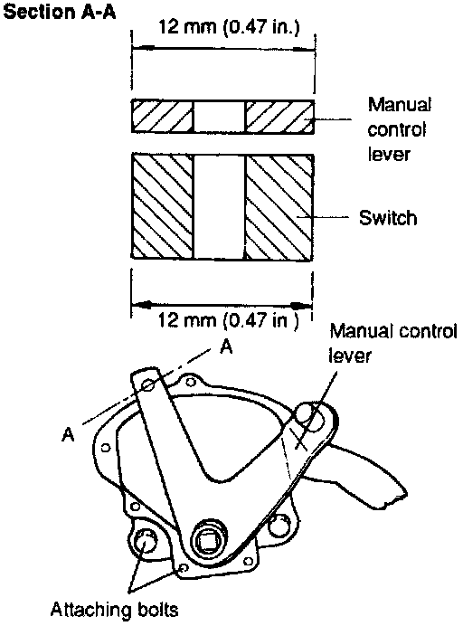 4. Turn the transaxle range switch body until the 12 mm (.47 in.) wide end of the manual control lever aligns with the switch body flange [12 mm (0.472 in.) wide portion].