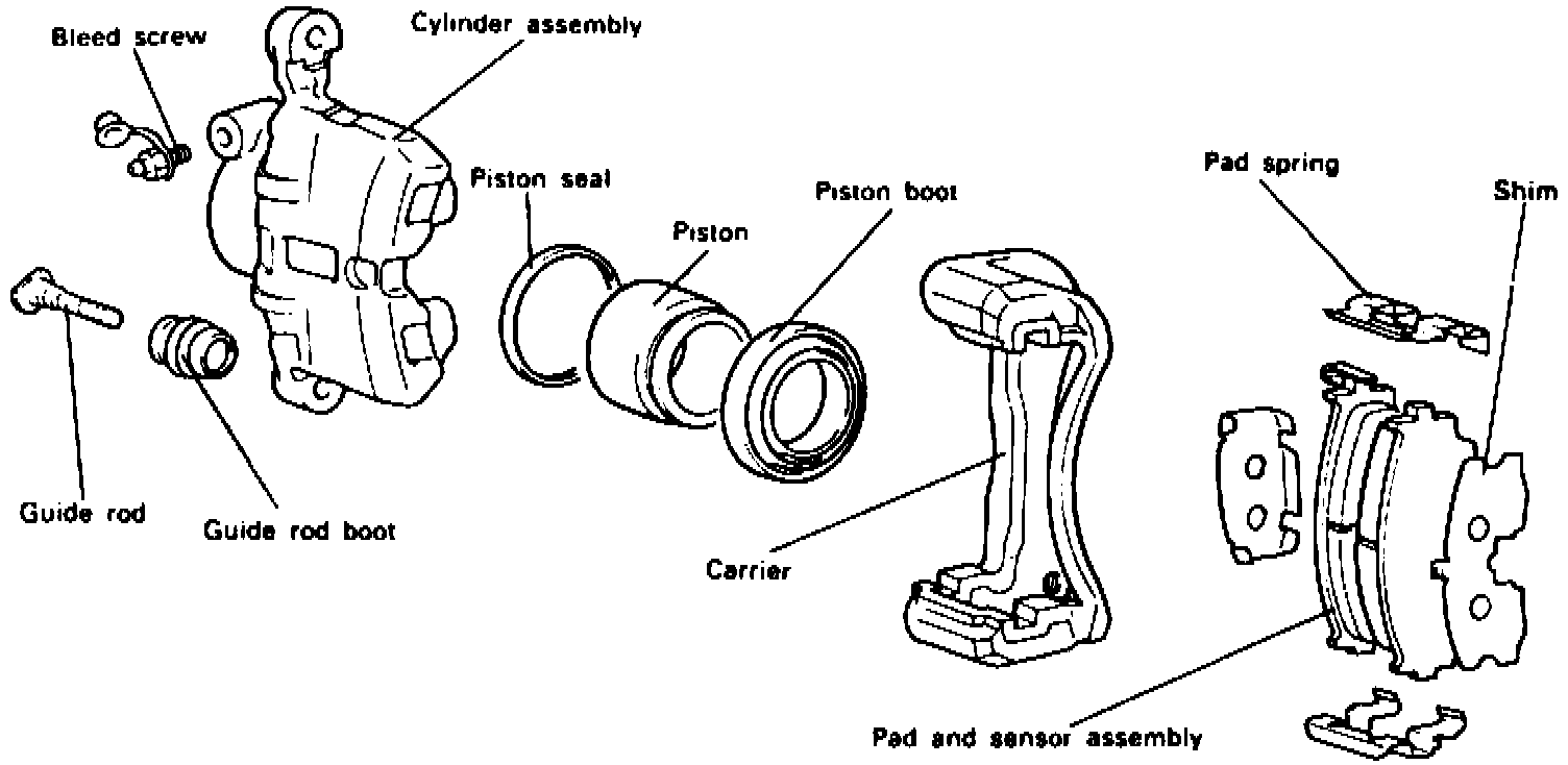 1. Raise and support vehicle, then remove wheel/tire assembly.Fig. 12 Exploded View Of Front Disc Brake Assembly: