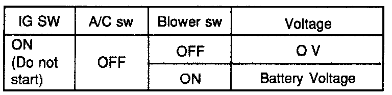 2. Measure voltage between terminal 4 of NC switch (I10) connector and body ground when blower switch is on and off. If not ok, check fuse No.18 and blower circuit. If ok, perform next check