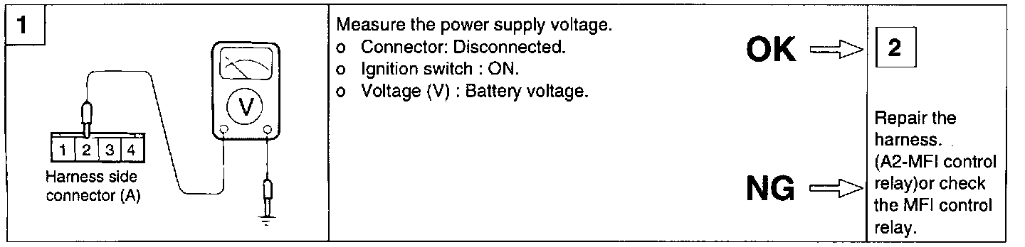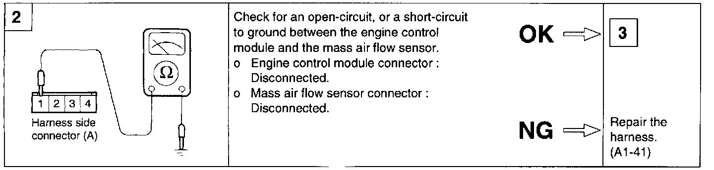 2. If the MAF sensor output voltage is other than 0 when the ignition switch is turned on (do not start the engine). Check for the faulty MAF sensor or ECM.