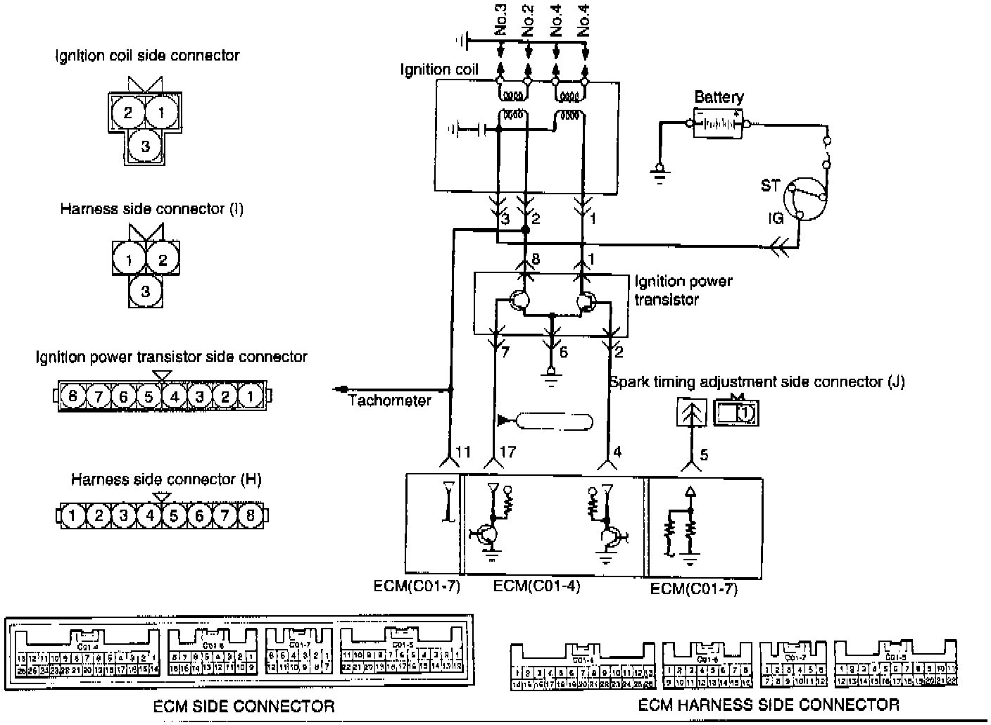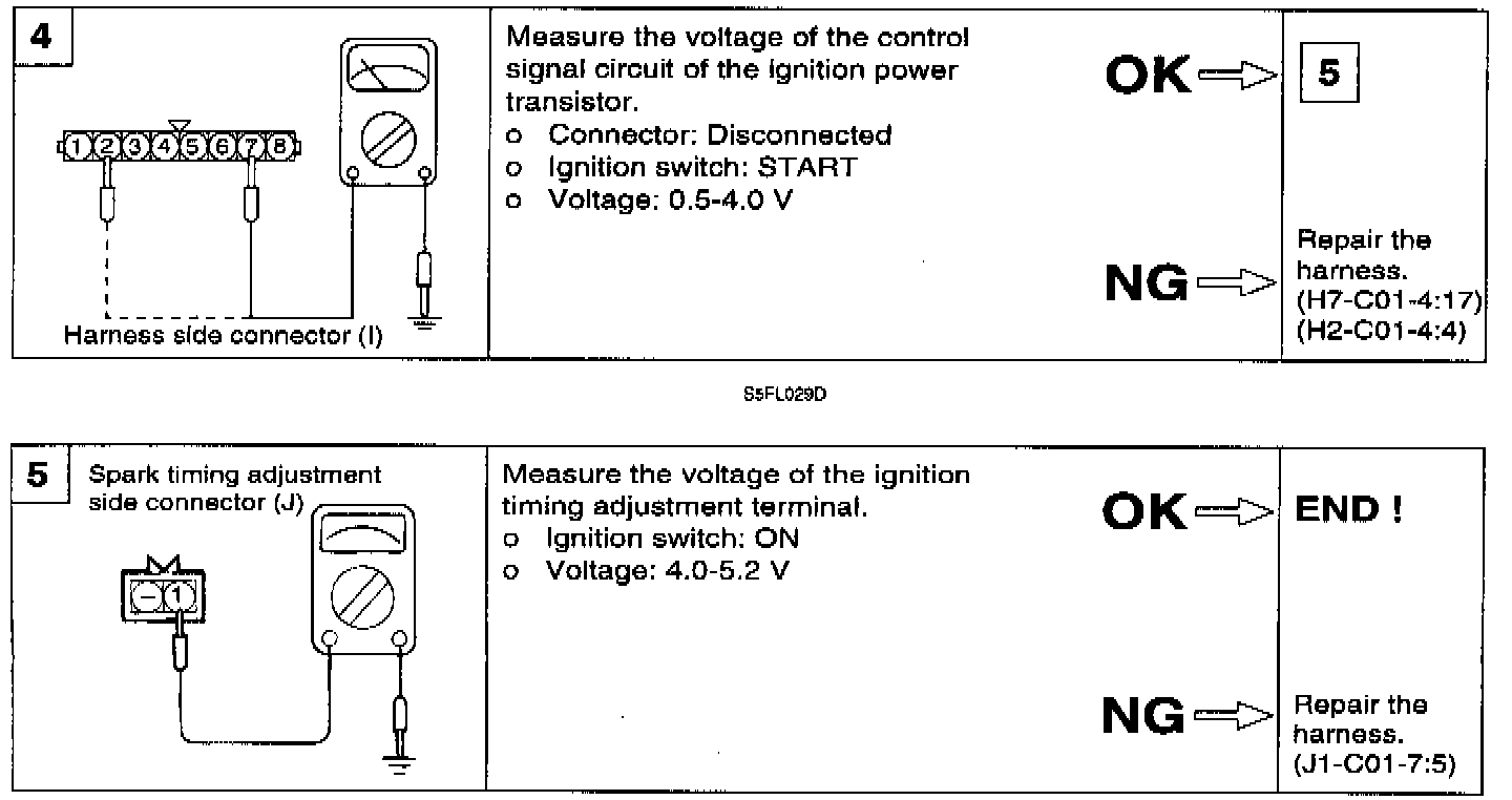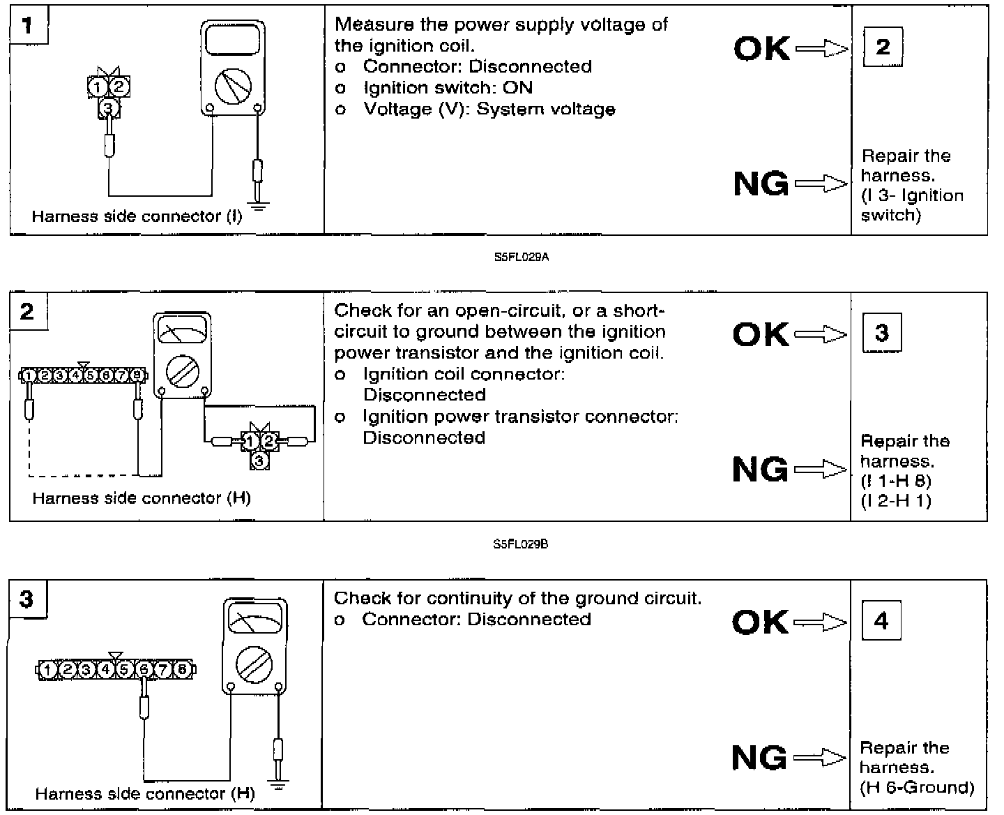 1. Measure the resistance between connector terminals 4 and 2 (the coils at the number 1 and number 4 cylinder sides) of the ignition coil. and between terminals 4 and 1 (the coils of the number 2 and number 3 cylinder sides).