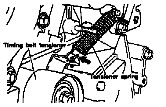 6. Back off the fixing bolts of the temporarily tightened tensioner one or two turns and tighten the timing belt with the tensioner spring force specified.