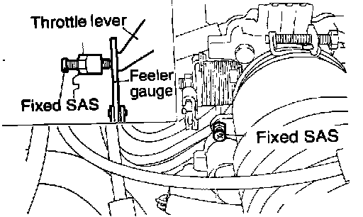 3. Insert a 0.65 mm (0.0256 in) thick feeler gauge between the fixed speed adjusting screw and the throttle lever.