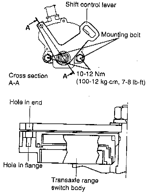 4. Rotate and adjust the park/neutral position switch body so the hole in the end of the manual control lever and the hole (cross section A-A in the figure) in the flange of the park/neutral position switch body are aligned.