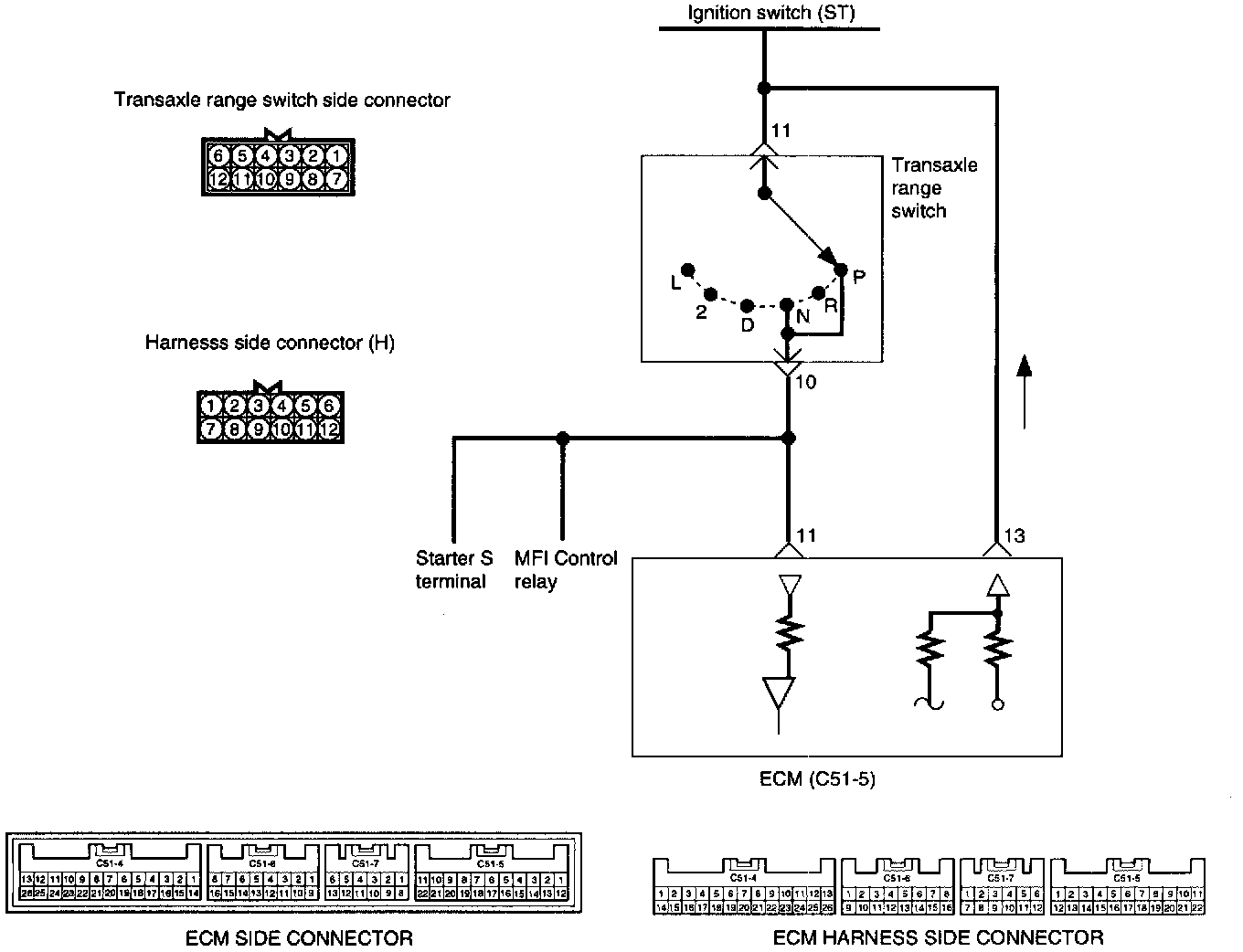 When the ignition switch is set to the ST position, battery voltage is applied through the ignition switch and transaxle range switch to the ECM.