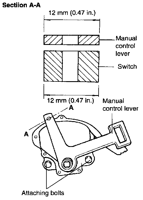 4. Turn the transaxle range switch body until the 12 mm (0.47 inch) wide end of the manual control lever aligns with the switch body flange [12 mm (0.472 inch) wide portion].