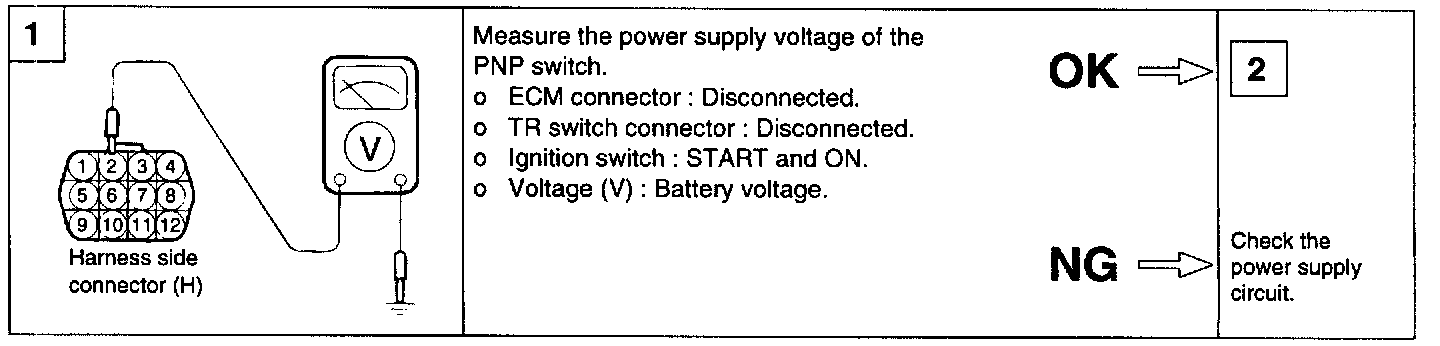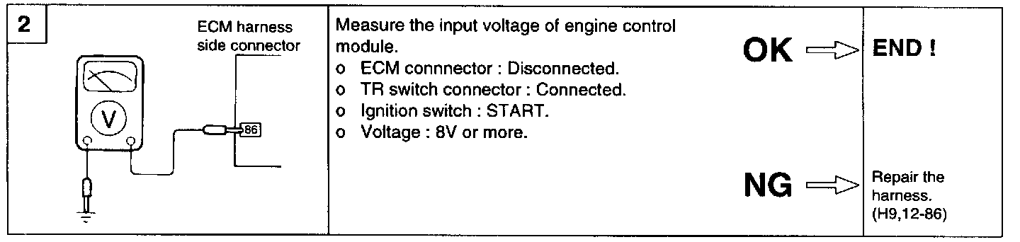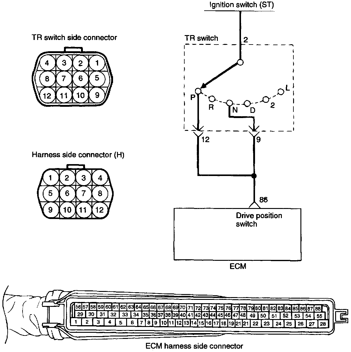 When the ignition switch is in the ST position, the battery voltage is applied through the ignition switch and inhibitor switch to the ECM. If the selector lever is not in P or N position, the battery voltage will not reach the ECM.
