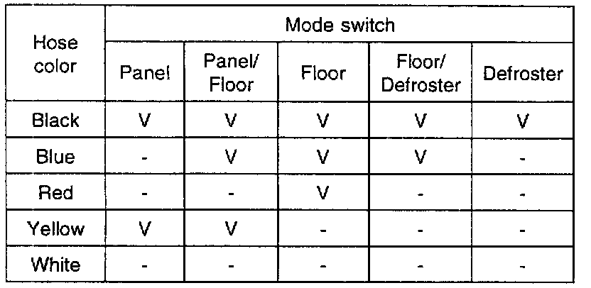 4. Check for vacuum hiss from the mode switch and vacuum hoses. and inspect for air flow between each hoses when the mode switch is at the each positions.