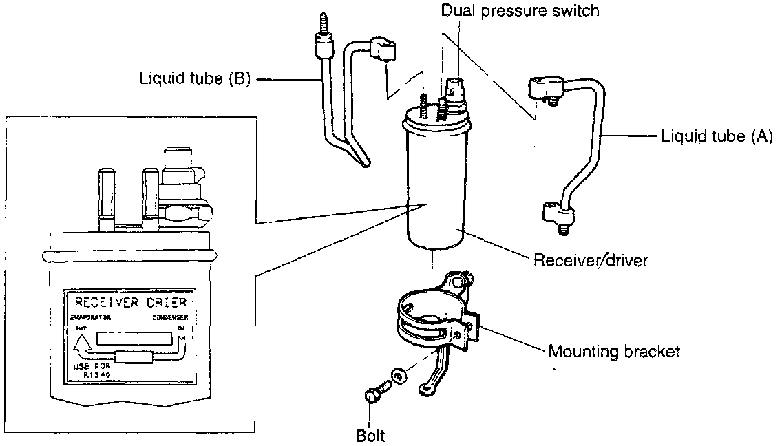 6. Remove the receiver/drier mounting bolt from the receive/drier mounting bracket.