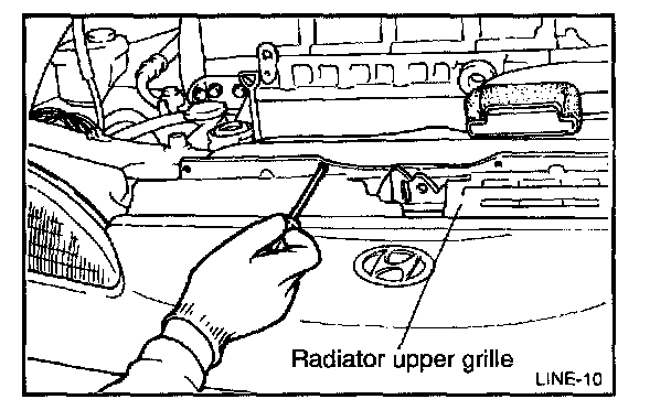 1. Discharge refrigerant from the air conditioning system.2. Remove the radiator upper grille.